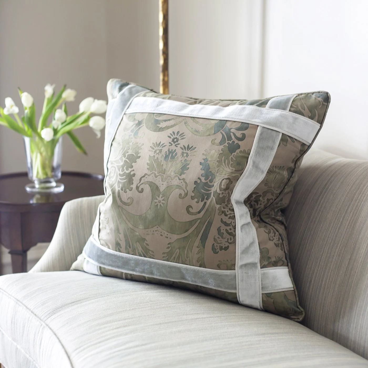 The redesigned, vaulted living room showcases McCord’s transitional aesthetic. Located adjacent to the main kitchen, the room is accessed through two arched cased openings or from a gallery hallway. Brass tiered chandeliers hang above two main seating areas; a third conversation nook is tucked into a windowed bay. In this room and throughout the home, McCord used a mix of antiques sourced on trips to Atlanta and some reproductions. Furniture is custom-upholstered in soft blues, greens and creams and is tailored but comfortable. McCord’s work has resulted in an airy, tranquil feeling about the room where large groups can gather but where the couple can also sit and enjoy time together.